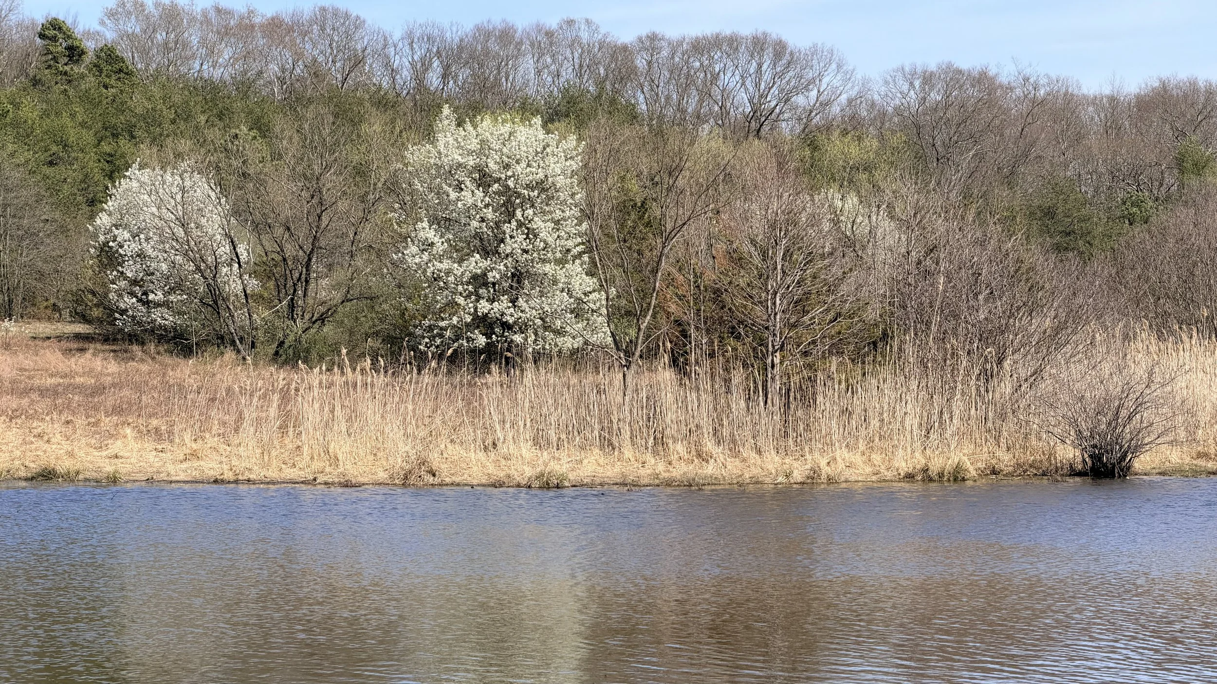 Bradford Pear trees in bloom on the banks of a local pond.