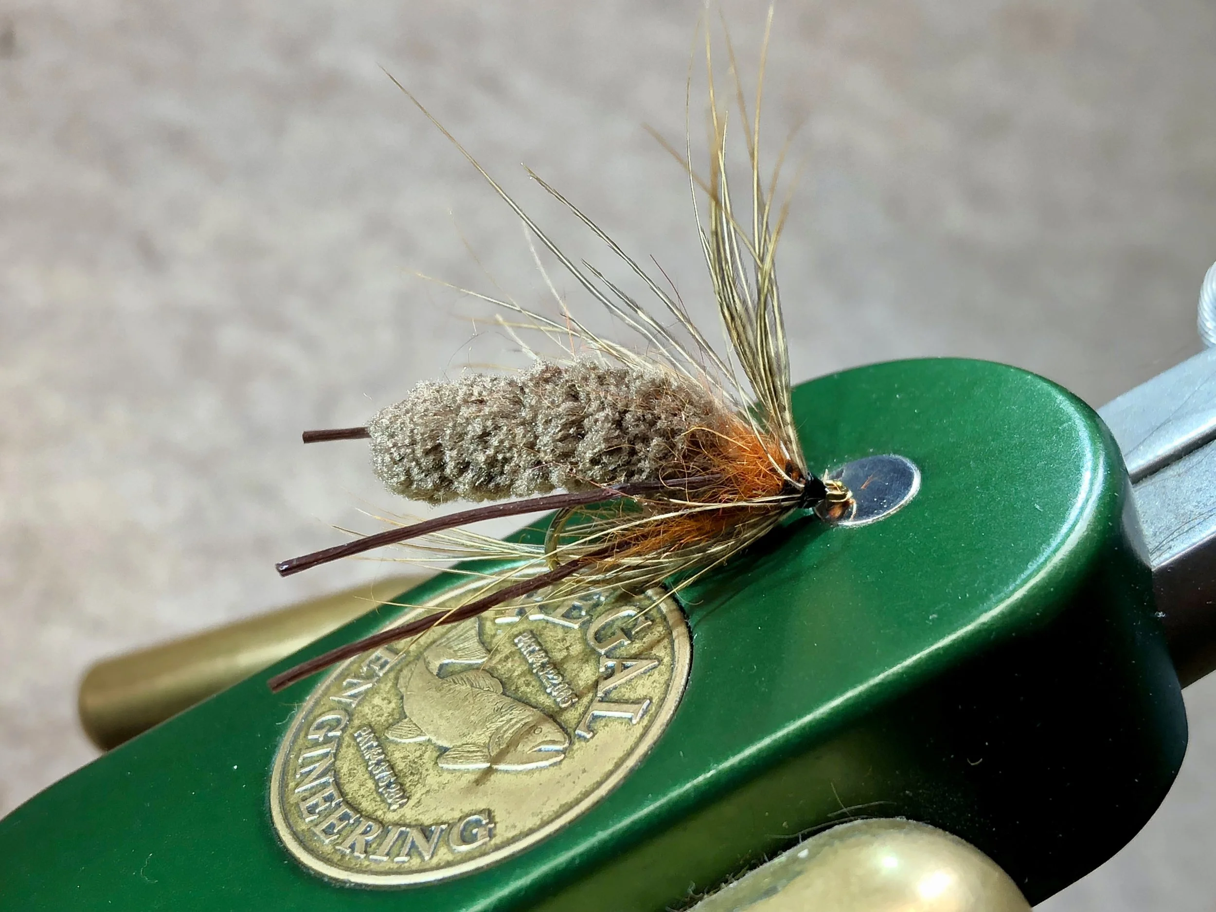 The Creature is a “mop-fly”, that is, a fly that is tied using dust mop fibers. But rather than simply lashing a mop fiber to the hook, this pattern includes rubber legs and pheasant rump feathers for extra movement, along with a dubbed hot spot of contrasting color. I fish the Creature with a slow hand-twist retrieve, pausing occasionally. On the pause, the fly hovers and then sinks very slowly. The fish tend to hold onto the soft, fleshy mop material longer than with other flies, allowing me to detect subtle takes in cold water.